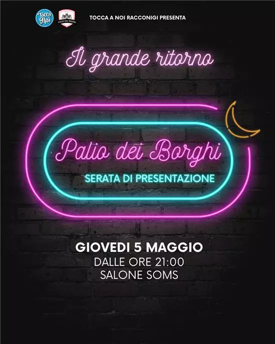 Descrizione Serata di Presentazione del Palio dei BorghiGiovedì 5 maggio, ore 21 in SOMS, non mancare e indossa i tuoi colori! Chi sarà il prossimo campione di Racconigi?