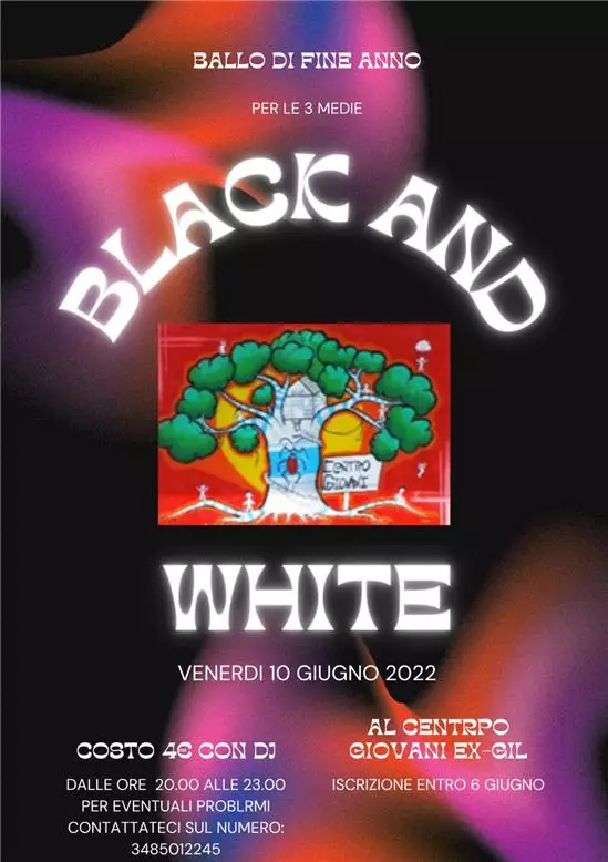 Descrizione Black and WhiteBallo di fine anno per le terze medieVenerdì 10 giugno, dalle ore 20 alle ore 23.Ingresso 4 euro.Iscrizioni entro il 6 giugno.