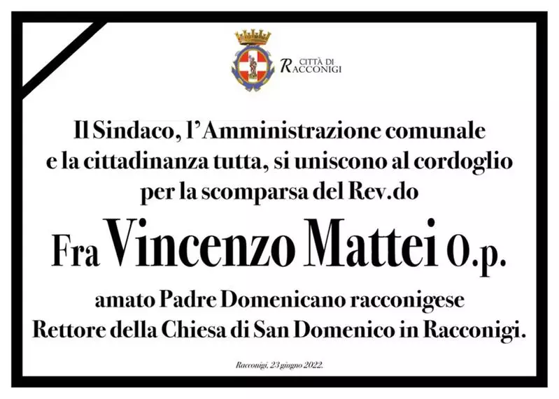 Descrizione Il Sindaco, l'Amministrazione comunale e la cittadinanza tutta, si uniscono al cordoglio per la scomparsa del Rev.doFra Vincenzo Mattei O.p.amato Padre Domenicano racconigeseRettore della Chiesa di San Domenico in Racconigi
