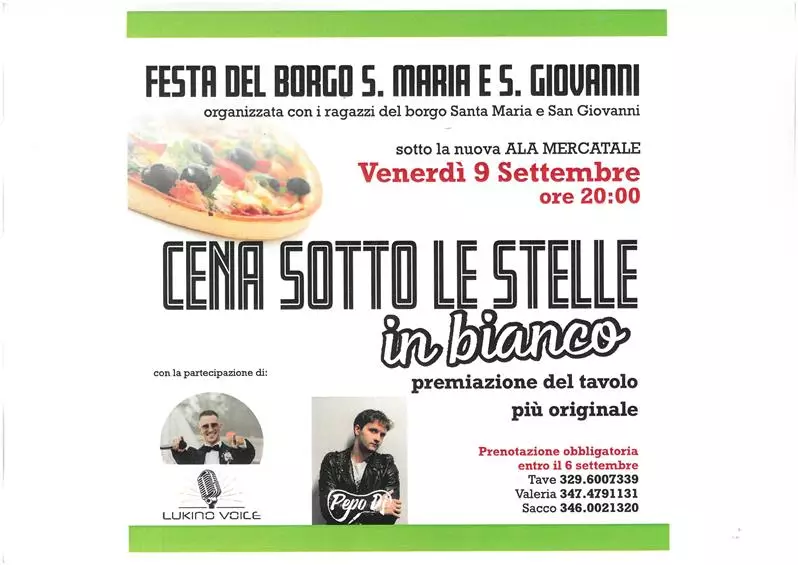 Descrizione CENA SOTTO LE STELLE in biancocon la partecipazione di Lukino Voice e Pepo Dj.Premiazione del tavolo più originale.Prenotazione obbligatorio entro il 6 settembreTave 3296007339Valeria 3474791131Sacco 3460021320