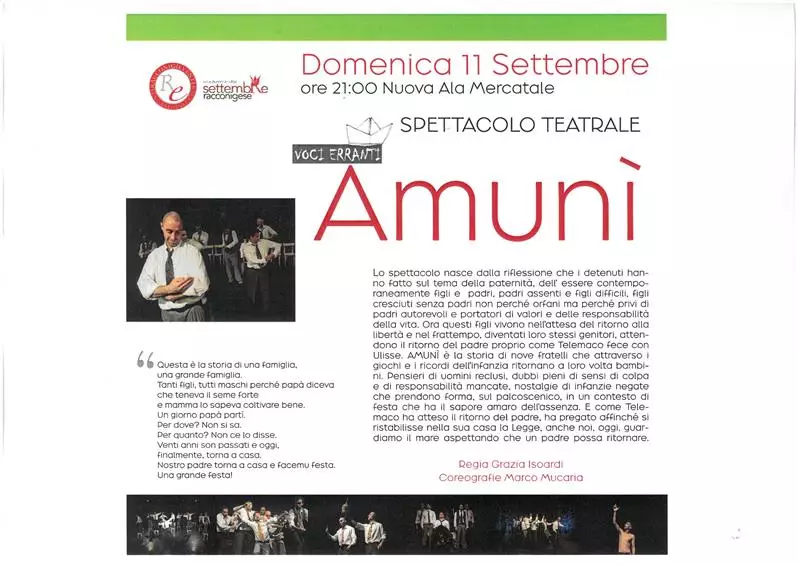 Lo spettacolo nasce dalla riflessione che i detenuti hanno fatto sul tema della paternità, dell’ essere contemporaneamente figli e padri, padri assenti e figli difficili, figli cresciuti senza padri non perché orfani ma perché privi di padri autorevoli e portatori di valori e delle responsabilità della vita. Ora questi figli vivono nell’attesa del ritorno alla libertà e nel frattempo, diventati loro stessi genitori, attendono il ritorno del padre proprio come Telemaco fece con Ulisse. AMUNÌ è la storia di nove fratelli che attraverso i giochi e i ricordi dell’infanzia ritornano a loro volta bambini. Pensieri di uomini reclusi, dubbi pieni di sensi di colpa e di responsabilità mancate, nostalgie di infanzie negate che prendono forma, sul palcoscenico, in un contesto di festa che ha il sapore amaro dell’assenza. E come Telemaco ha atteso il ritorno del padre, ha pregato affinché si ristabilisse nella sua casa la Legge, anche noi, oggi, guardiamo il mare aspettando che un padre possa ritornare.