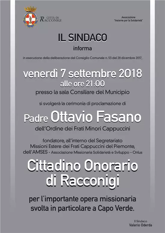 si svolgerà la cerimonia di proclamazione di Padre Ottavio Fasano, dell'ordine dei Frati Minori Cappuccini, fondatore, all'interno del Segretariato Missioni Estere dei Frati Cappuccini del Piemonte, dall'Amses (Associazione missionaria Solidarietà e Sviluppo - Onlus)