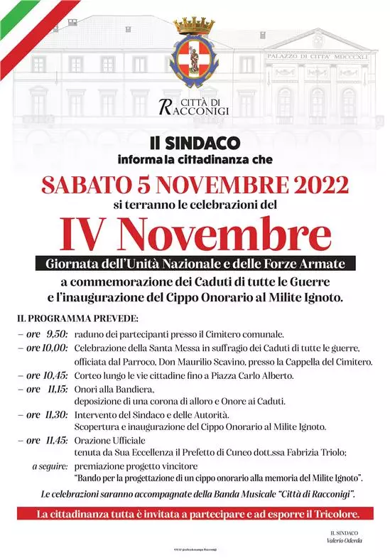 Sabato 5 novembre, a partire dalle ore 9:50, si terranno a Racconigi le consuete celebrazioni per la "Giornata dell'Unità Nazionale e delle Forze Armate". Durante la mattinata verrà inaugurato il cippo onorario alla memoria del Milite Ignoto, realizzato dagli studenti vincitori del concorso promosso dall’Amministrazione comunale negli scorsi mesi. L’iniziativa ha dato la possibilità agli alunni delle scuole superiori di cimentarsi nella progettazione di un monumento per onorare gli eroi di guerra che hanno combattuto per la patria.