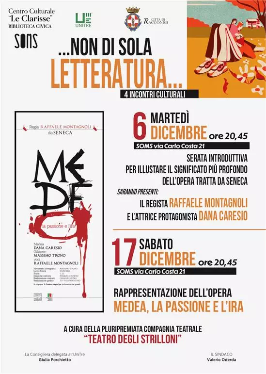 Medea, uno dei più celebri e complessi personaggi del mondo classico, sarà protagonista alla Soms di Racconigi, con uno spettacolo della pluripremiata compagnia ʺTeatro degli Strilloniʺ di Torino. L’appuntamento sarà sabato 17 dicembre, alle ore 20:45, con la rappresentazione ʺMedea. La passione e l’iraʺ, tratta da Seneca.