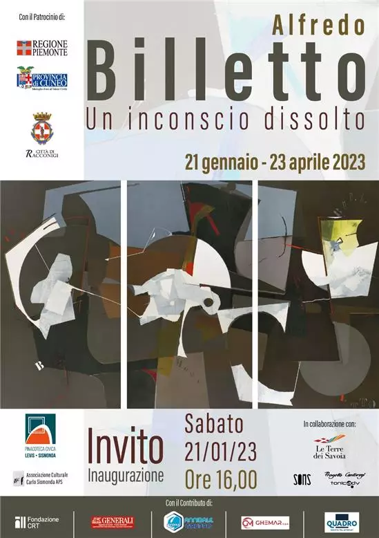 Mostra intitolata “Alfredo Billetto. Un inconscio dissolto” negli spazi della Pinacoteca civica Levis Sismonda, a Racconigi fino al 23 aprile. Una rassegna dedicata al noto artista torinese Alfredo Billetto (27 aprile 1932 – 9 dicembre 2022), e ad alcuni dei maestri, suoi amici e colleghi, con i quali condivise le esperienze espressive dell’ambiente culturale del Novecento torinese.