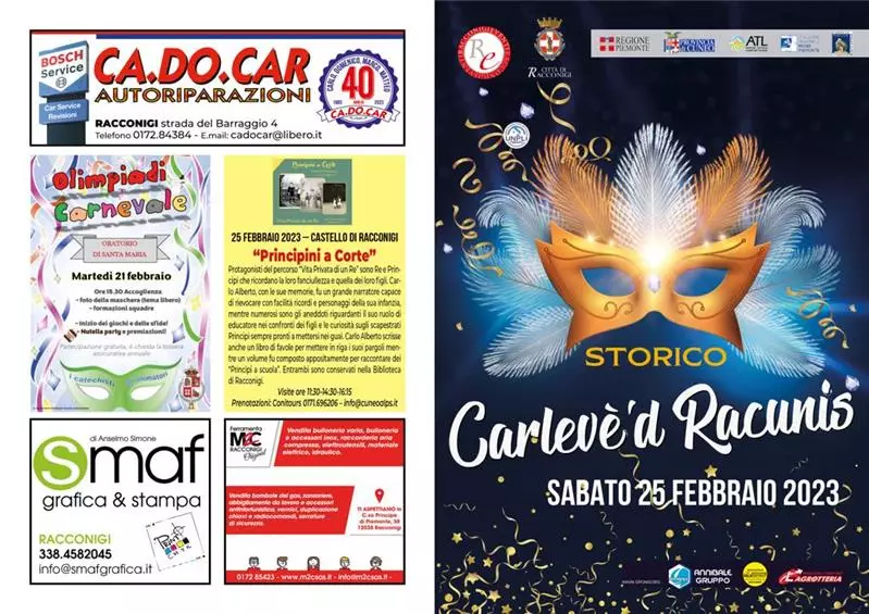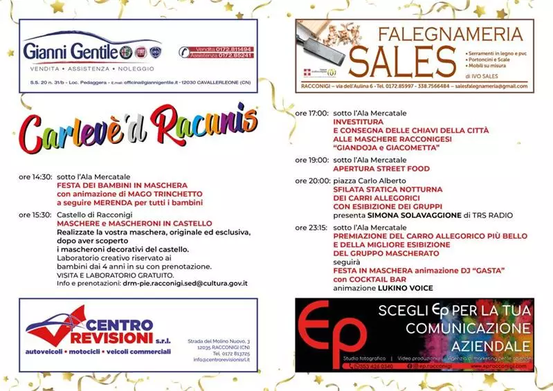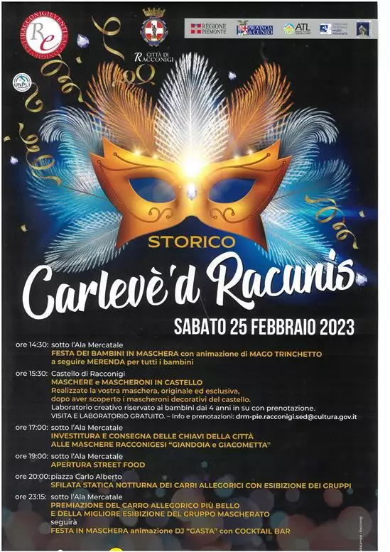 Nella giornata di sabato 25 febbraio, a partire dalle ore 14:30, a Racconigi è in programma la tradizionale festa di Carnevale, con eventi per grandi e piccini.
