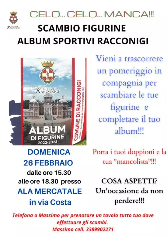A poco più di due mesi dall'uscita dell’album di figurine ufficiale degli atleti e delle associazioni sportive racconigesi, album che ha riscosso grande successo in città, l’amministrazione comunale ha scelto di organizzare, domenica 26 febbraio dalle ore 15,30 alle 18,30 presso l’ala mercatale in via Costa, un pomeriggio di “scambio figurine" fra i collezionisti per contribuire al completamento della raccolta.