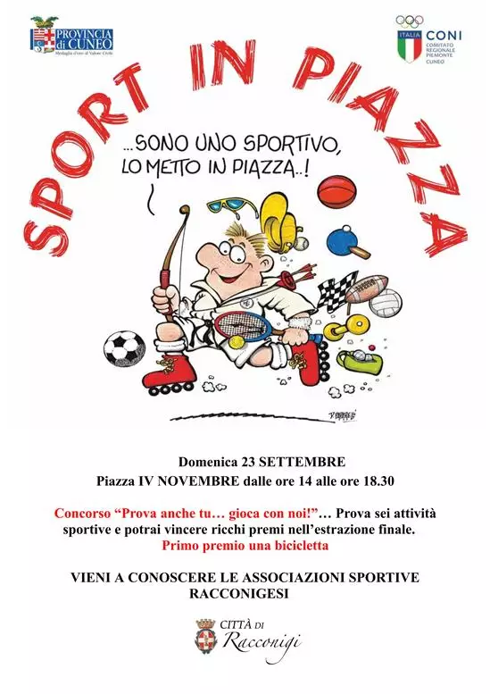L’edizione 2018 di SPORT IN PIAZZA sarà la FESTA DELLO SPORT e la FESTA PER TUTTI. E’ questo lo slogan della grande manifestazione, aperta a tutta la cittadinanza, che si svolgerà DOMENICA 23 SETTEMBRE in piazza IV Novembre a partire dalle ore 14. Una kermesse sportiva che è il risultato della collaborazione tra l’Amministrazione comunale e i rappresentanti delle Associazioni sportive racconigesi.