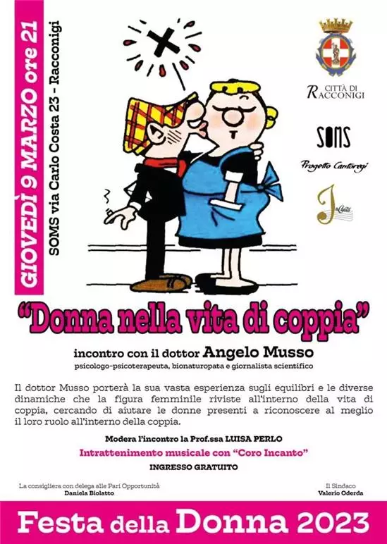 In occasione della Festa della Donna, il comune di Racconigi organizza per giovedì 9 marzo, alle ore 21 presso la Soms, un incontro dal titolo "Donna nella vita di coppia”.