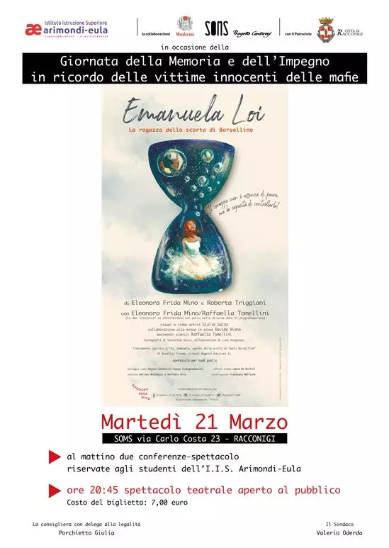 Alla ore 20:45 invece, sempre alla Soms, andrà in scena lo spettacolo "Emanuela Loi - la ragazza della scorta di Borsellino", promosso dall'Associazione Bonaventura, con l'attrice professionista Emanuela Frida Mino.