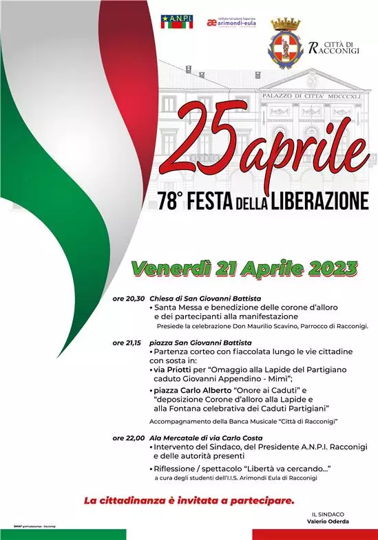 Infine, alle ore 22, nell’ala mercatale di via Carlo Costa, dopo l’intervento del sindaco, del Presidente A.N.P.I. sezione di Racconigi e delle autorità presenti, andrà in scena la riflessione-spettacolo “Libertà va cercando…” a cura degli studenti dell’I.I.S. “Arimondi-Eula” di Racconigi.