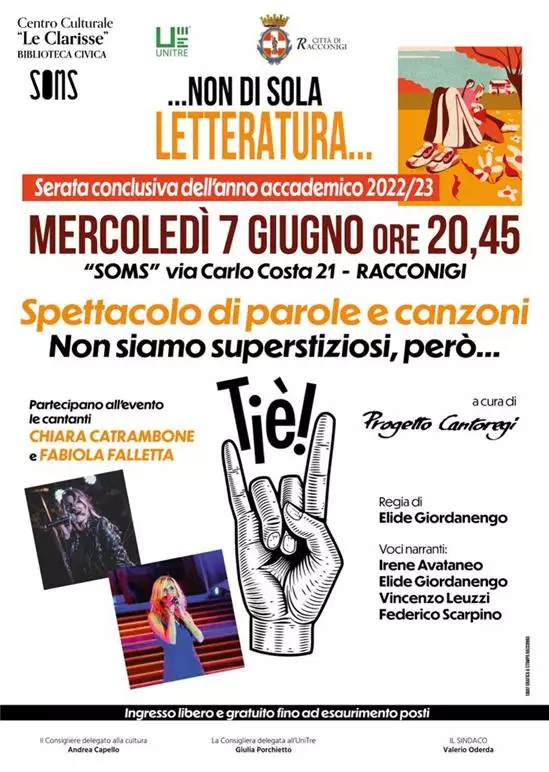Mercoledì 7 giugno, alle ore 20:45, la Soms di via Carlo Costa a Racconigi ospiterà la serata conclusiva dell’anno accademico 2022-2023 dell’Università delle Tre Età e della rassegna culturale “Non di sola letteratura...”; per l’occasione andrà in scena lo spettacolo “Non siamo superstiziosi, però...tiè!”, con la regia di Elide Giordanengo.