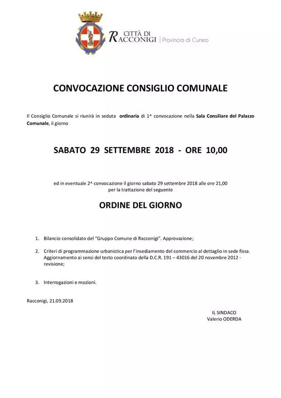 Il Consiglio Comunale si riunirà in seduta ordinaria di 1^ convocazione nella Sala Consiliare del Palazzo Comunale, il giorno
