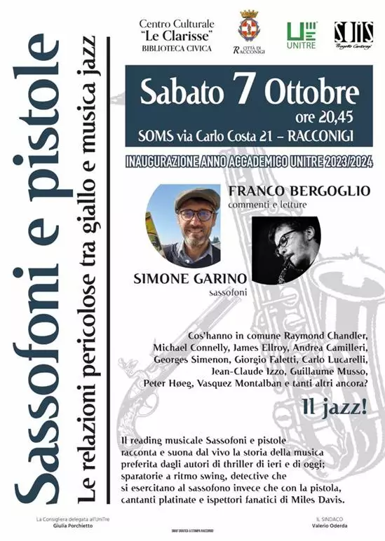 Per l’occasione andrà in scena lo spettacolo “Sassofoni e pistole. Le relazioni pericolose tra giallo e musica Jazz”, a cura di Franco Bergoglio (commenti e letture) e Simone Garino (sassofoni).