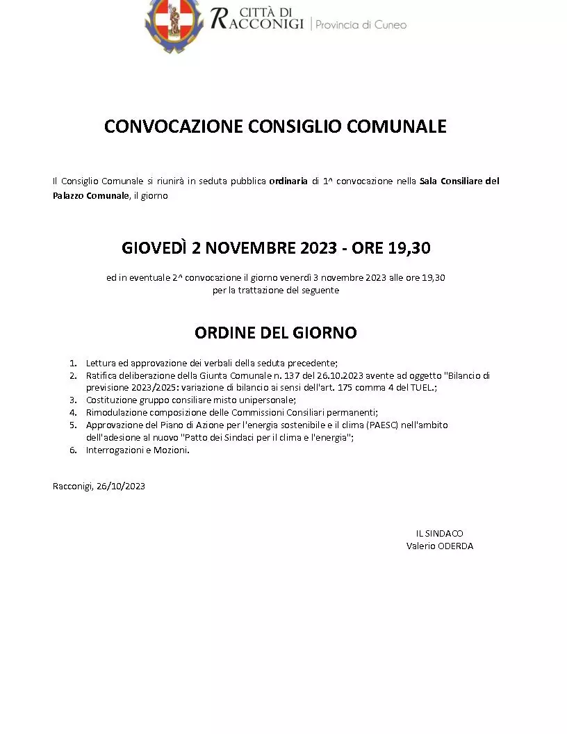 É in programma giovedì 2 novembre, alle ore 19:30, il Consiglio comunale di Racconigi, che si terrà nella sala consiliare del palazzo comunale.