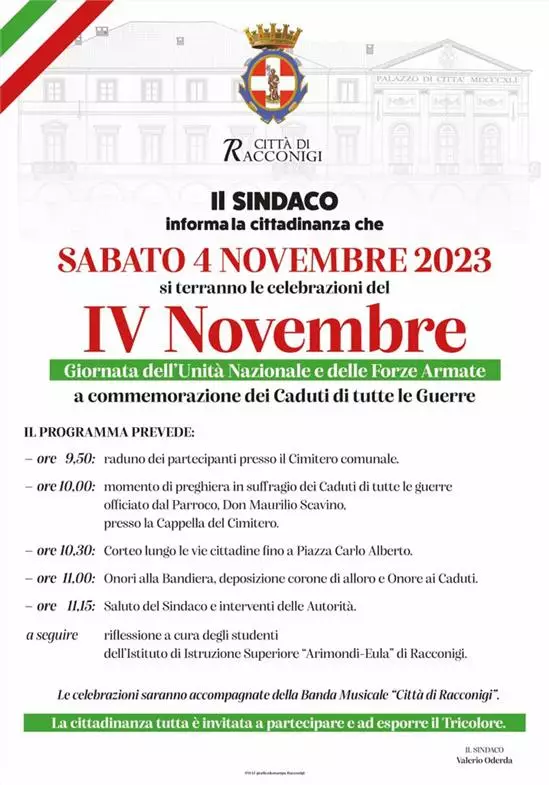 “Invitiamo tutti i cittadini, giovani e meno giovani, ad esporre il tricolore e a partecipare alle celebrazioni per ricordare tutti coloro che hanno dato la vita per la patria – commenta il sindaco di Racconigi Valerio Oderda - Questa giornata è una grande opportunità per riflettere sulla storia d’Italia e per onorare chi ha difeso e continua a difendere la sovranità e la sicurezza del nostro paese”.