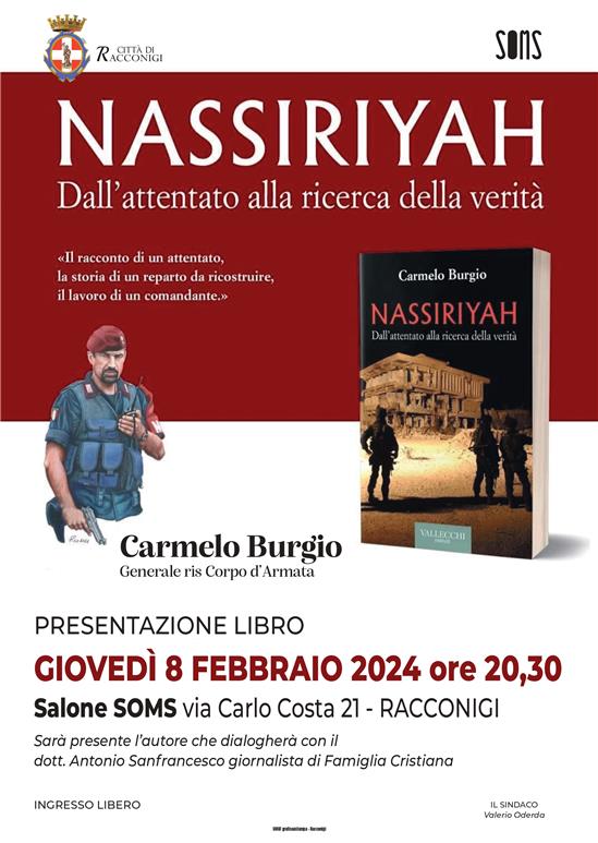 Sarà infatti presente il generale di Corpo d’Armata Carmelo Burgio, che presenterà al pubblico il suo ultimo libro “Nassiriyah, dall’attentato alla ricerca della verità”, opera che narra, con la voce di un comandante, il racconto di un attentato e la storia di un reparto da ricostruire.