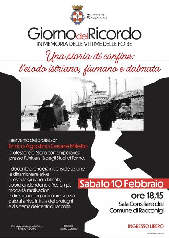 In occasione delle celebrazioni per il Giorno del Ricordo, sabato 10 febbraio, alle ore 18:15, è in programma nella sala consiliare del Palazzo comunale di Racconigi un intervento dal titolo “Una storia di confine: l’esodo istriano, fiumano e dalmata”, a cura del professor Enrico Agostino Cesare Miletto, docente di storia contemporanea all’Università degli Studi di Torino, saggista ed esperto dell’argomento.