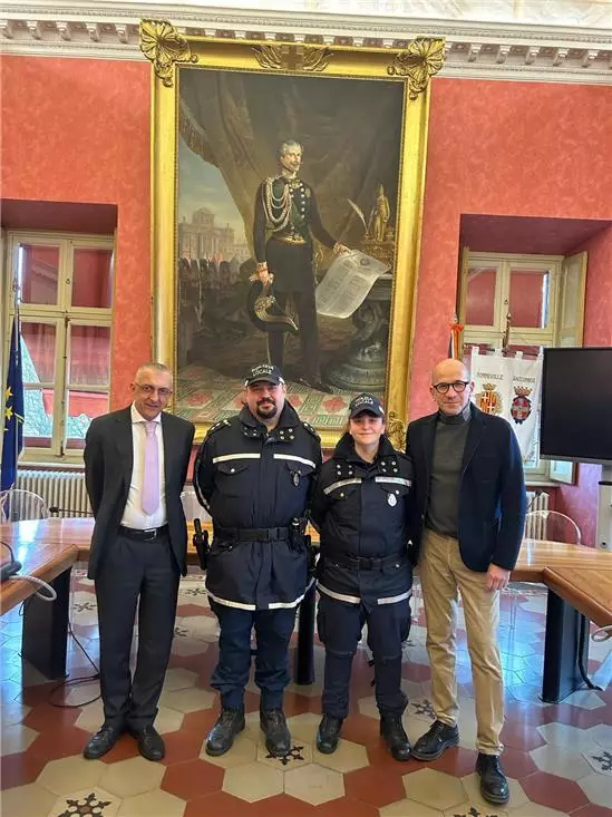In foto: l’Ispettore Vito Tartaglia e l’Agente Gloria Vassallo insieme al sindaco di Racconigi Valerio Oderda e al consigliere Domenico Annibale.