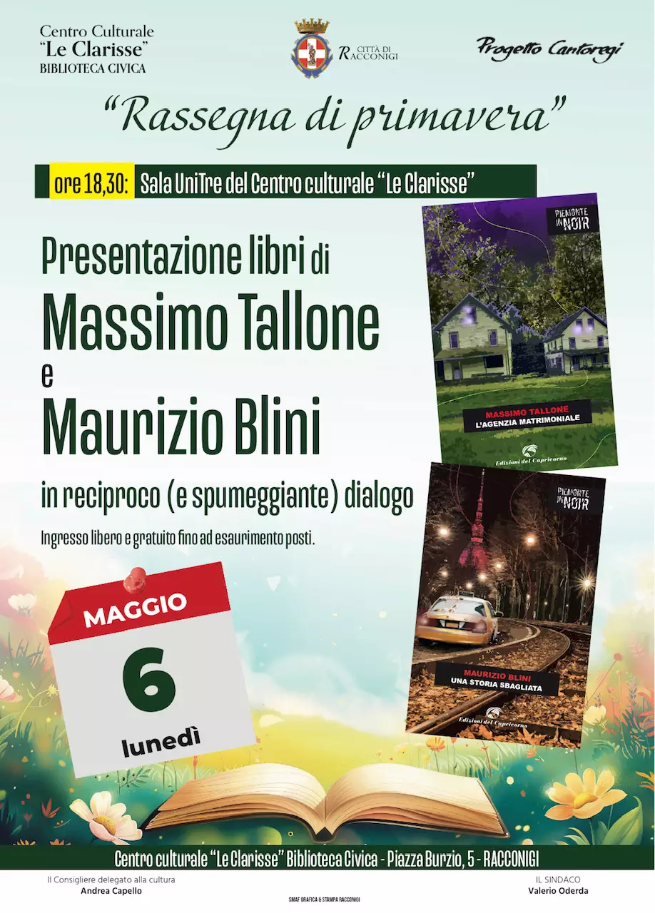 Lunedì 6 maggio, alle ore 18:30, la sala UniTre del Centro culturale “Le Clarisse” di Racconigi ospiterà una spumeggiante presentazione letteraria, durante la quale i due autori Maurizio Blini e Massimo Tallone dialogheranno sui propri ultimi romanzi “Una storia sbagliata” e “L’agenzia matrimoniale”, editi da “Edizioni del Capricorno” per la collana Piemonte in Noir.