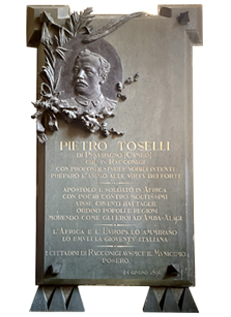 Le sconfitte in Etiopia fra il 1895 e il 1896 furono particolarmente brucianti perché patite ad opera di nemici considerati inferiori sotto tutti gli aspetti. Come il generale saviglianese Arimondi, anche l’ufficiale “racconigese” Toselli finì i suoi giorni in modo inglorioso e cruento; la lapide, però, dice che “morì come gli eroi e che l’Africa e l’Europa l’ammirano”. Pietro Toselli, da giovane, aveva iniziato la sua carriera militare “con profondi studi e nobili intenti” nell’allora collegio per gli ufficiali di Racconigi, che fu situato, dal 1829 al 1868, nell’edificio casermesco di via Ormesano, che divenne poi, nel 1869, il reparto Chiarugi del nascente Manicomio provinciale di Cuneo in Racconigi. Il giovane tenente aveva poi lasciato per sempre la nostra città, ma, dal 1873 al 1878, suo fratello Enrico era stato il secondo direttore generale del Manicomio di Racconigi: da notare, comunque, nella lapide stessa, la bellezza del busto di Pietro Toselli, riportato in alto ed in mezzo a motivi floreali, tipici del periodo “liberty”.
