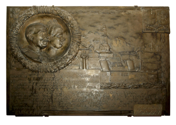 Fra il primo ed il secondo piano dello scalone d’onore del Municipio si può incontrare l’ultima delle sei lapidi storiche che lo ornano e l’unica a non essere in marmo botticino, perché si tratta di un bassorilievo bronzeo datato 1925 e realizzato dal Levis, in ricordo delle “Nozze d’argento” dei Sovrani d’Italia Vittorio Emanuele III di Savoia-Carignano ed Elena del Montenegro.